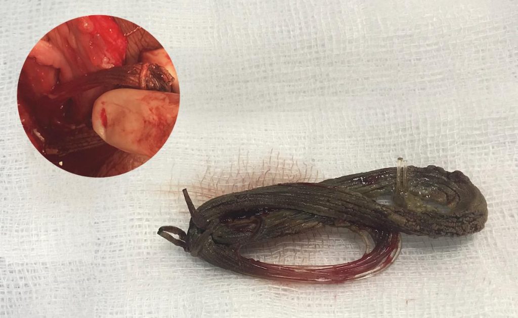 Trong quá trình phẫu thuật thám sát đường tiểu, ê kíp phẫu thuật phát hiện một vật lạ đã ăn sâu xuyên qua thành niệu đạo đến sát vách thể hang của dương vật. Dị vật được lấy khỏi niệu đạo là một đoạn dây cước câu cá đã đóng sỏi xung quanh thành khối có kích thước 2,5cmx6cm.