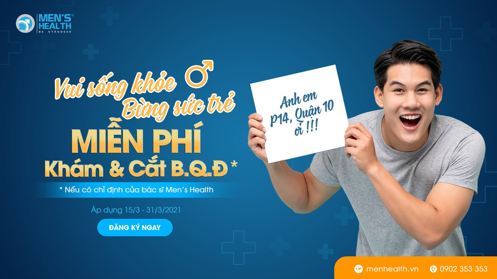 Nhằm ủng hộ tinh thần và tiếp sức cho thanh niên đang sinh sống và học tập ở Phường 14, Quận 10, Thành phố Hồ Chí Minh, Trung tâm Sức khỏe Nam giới Men’s Health dành tặng ưu đãi: “Miễn phí khám & cắt bao quy đầu” từ ngày 15/03/2021 – 15/04/2021.