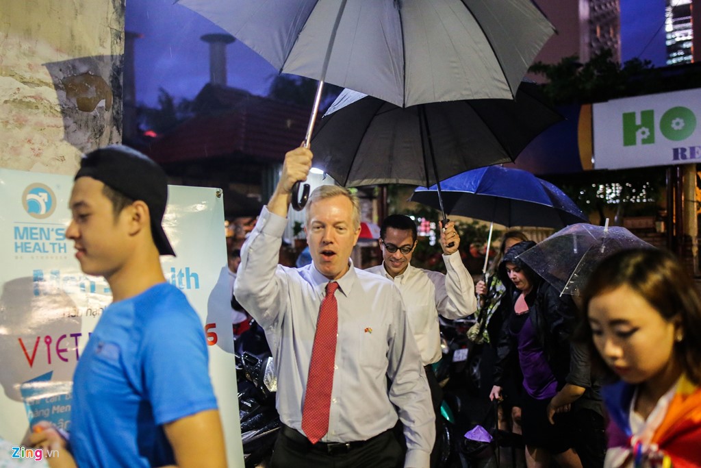 Dù trời đổ mưa tầm tã suốt đêm 26/8, đại sứ Mỹ tại Việt Nam Ted Osius cùng bạn đời vẫn che ô, đội mưa đến dự sự kiện của giới trẻ TP HCM.
