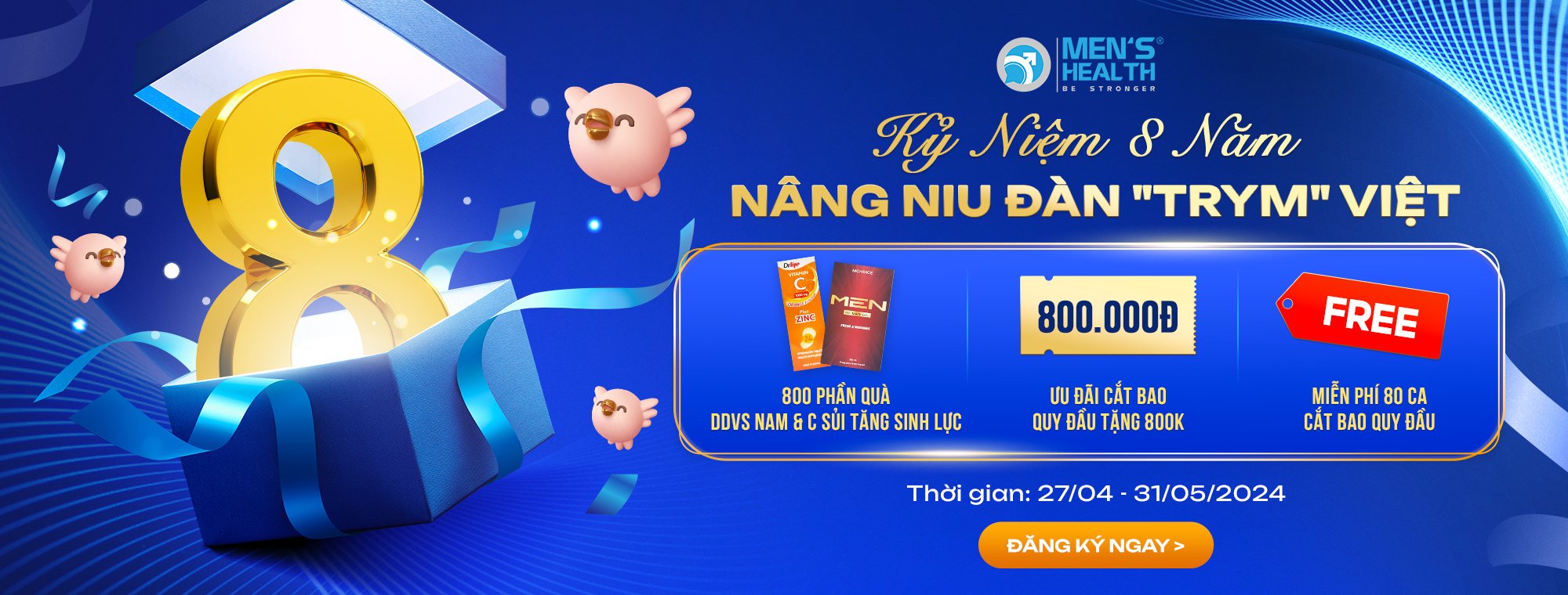 Tri ân khách hàng đã lựa chọn và gắn bó lâu năm cùng Trung Tâm Sức Khỏe Nam Giới Men’s Health suốt 8 năm qua, nay Men’s Health triển khai ưu đãi như một lời cảm ơn đến quý khách hàng với nhiều món quà đặc biệt: