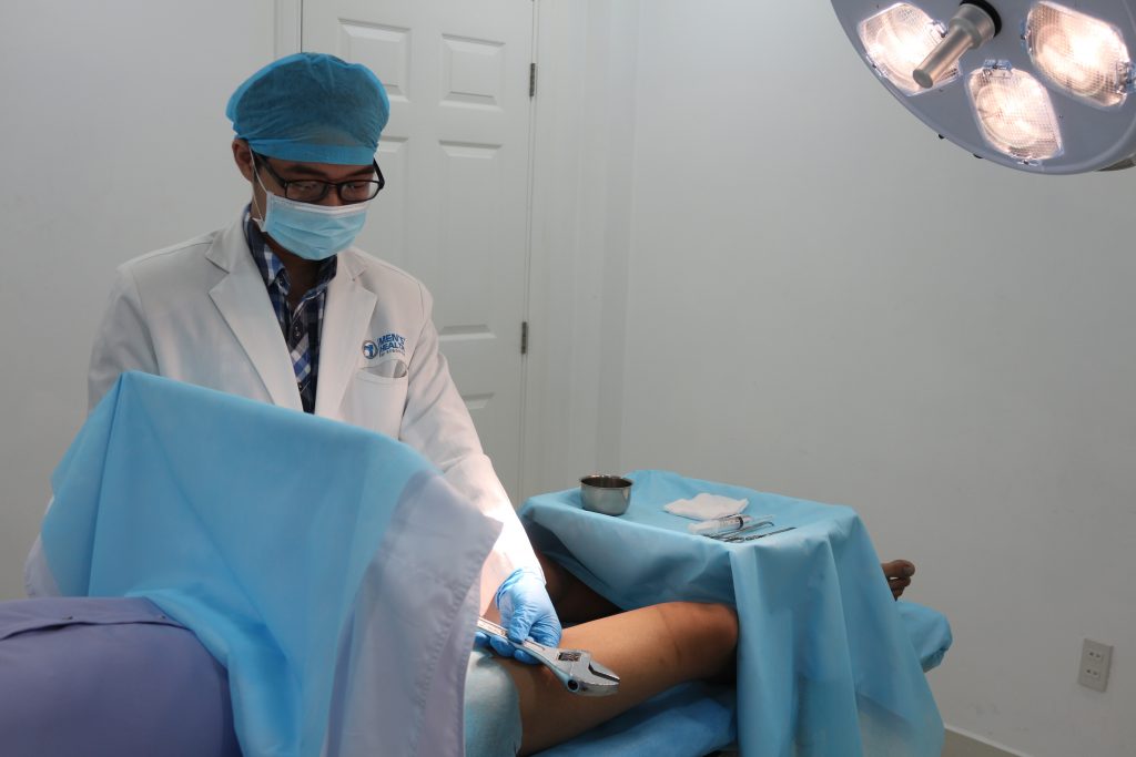 Đang trong cơn hưng phấn, chàng trai trẻ bắt đầu thấy phần đầu dương vật tím đen một cách lạ lùng, dù không đau nhưng sờ cũng không thấy cảm giác. T. kể, vì cậu bé của mình cũng khá đặc biệt, to ở đầu và nhỏ dần về phần thân và gốc nên anh quyết định kéo tuột chiếc mỏ lết về phần đuôi để cảm thấy dễ chịu hơn và hy vọng cậu bé sẽ xìu xuống và lấy ra được. Tuy nhiên, khi kéo đến phần gốc thì “cậu nhỏ” lại không thể nào xìu xuống, mặc dù cảm giác sung sướng ban đầu đã bị nỗi sợ hãi và cơn đau tức xâm chiếm. Tiến thoái lưỡng nan, chuyện xấu hổ vậy không biết nói cùng ai, thế là cậu bạn chấp nhận chịu trận hơn 2 giờ, nhưng sau đó “cậu bé” vẫn cương cứng và triệu chứng đau ngày một tăng. Anh bạn trẻ buộc phải khai thật với người thân và được đưa đến cấp cứu ngay tại cơ sở y tế chuyên về Nam khoa. Bác sĩ Đoàn Anh SangTrung tâm sức khỏe Nam giới Men’s Health, người trực tiếp xử trí cấp cứu cho bệnh nhân cho hay, khi thăm khám thì dương vật của cậu vẫn còn cương cứng, phần đầu đã chuyển sang màu tím đen. Bác sĩ Sang xác định nguyên nhân là do vòng mỏ lết thắt nghẹt ở phần gốc làm cho máu ở dương vật không lưu thông được nên dẫn đến hiện tượng cương dương vật kéo dài. Nhận thấy tình huống khá nguy cấp, BS. Sang ngay lập tức thực hiện gây tê gốc dương vật và tiến hành quấn chật phần thân “cậu bé” bằng găng tay được cắt dài thành dây bản lớn và quấn quanh thân dương vật nhằm làm giảm đường kính cậu bé và kéo dây gang để mỏ lết di chuyển ra theo giống kiểu tháo nhẫn thông dụng để lấy mỏ lết ra. Sau 2 giờ đồng hồ quay mỏ lết ngược chiều thì “cậu nhỏ” cũng đã thoát nạn. Rất may sau đó, kích thước cũng đã giảm đi và màu sắc dương vật dần trở lại bình thường nhưng phần da bên ngoài có trầy xước vài chỗ.